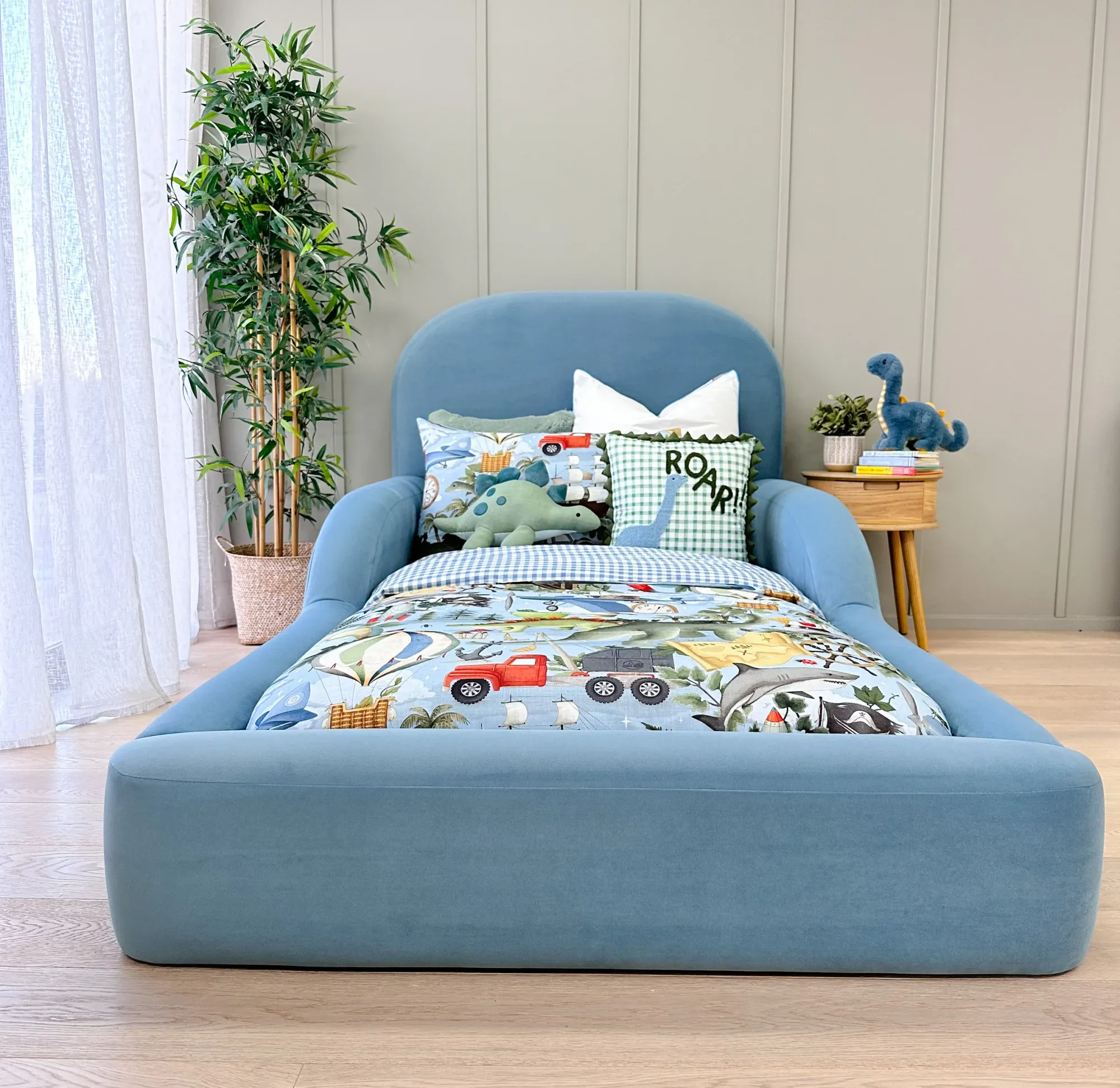 The Tulum Bed is a low-to-the-ground, made-to-order bed designed with neurodivergent children in mind.